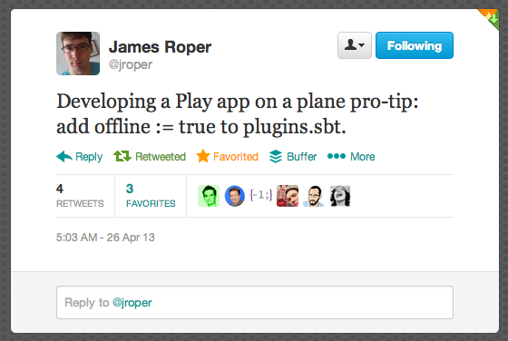 “Developing a Play app on a plane pro-tip: add offline := true to plugins.sbt”